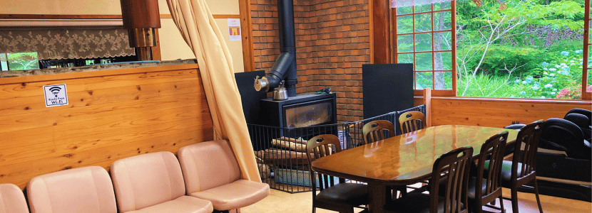 本館のロビーには、暖炉が設置されており、火の温かさと心地よいリラックス空間が広がります。